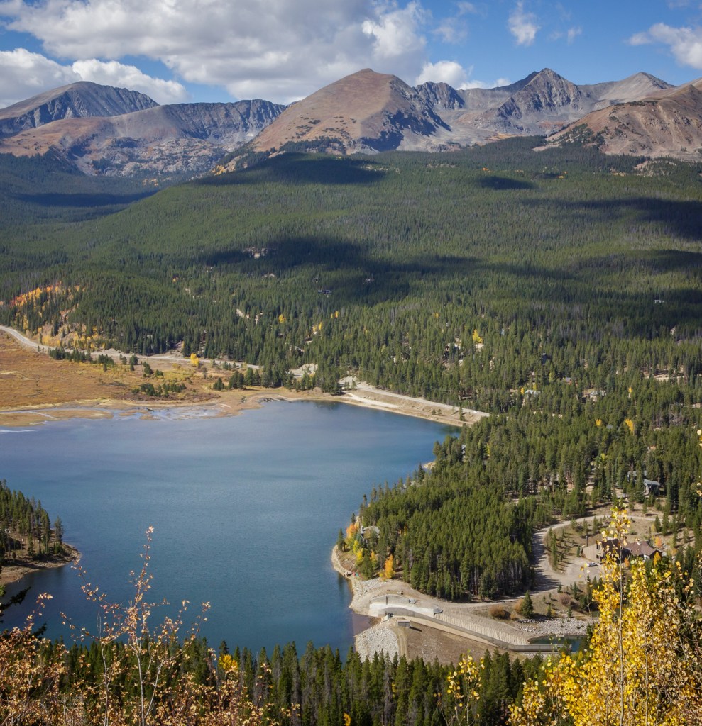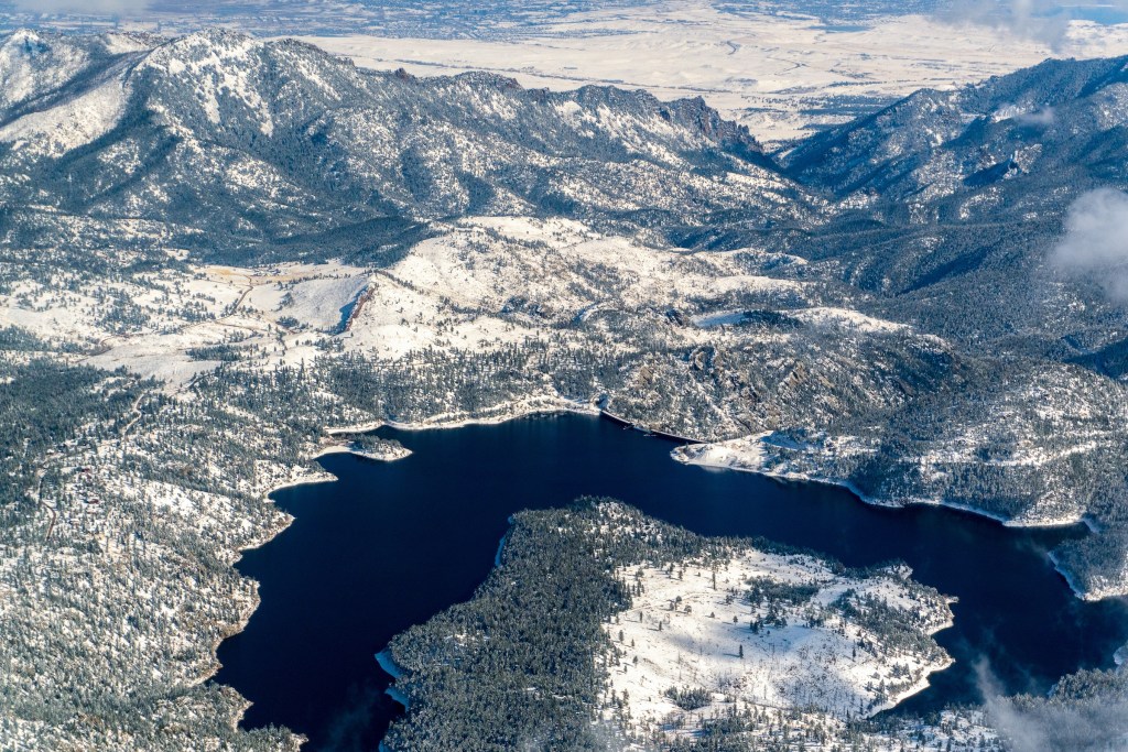 Gross Reservoir, southwest of Boulder, Colorado, in October 2019. The reservoir, which supplies Denver Water customers on the Front Range, depends heavily on snowmelt. Photo by Mitch Tobin/The Water Desk. Aerial support provided by LightHawk.