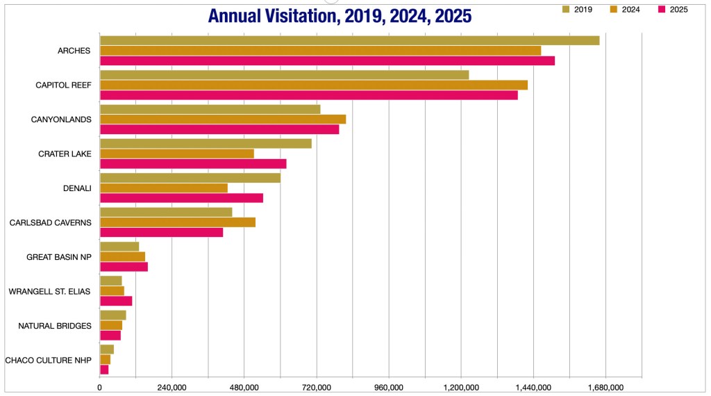 Over the summer of 2025, that appears to have led to a drop in visitation to most national parks in the Southwest. However, visitation tended to rebound in the fall โ perhaps due to lower gas prices โ bringing the annual numbers back up to close to what they were in 2024.