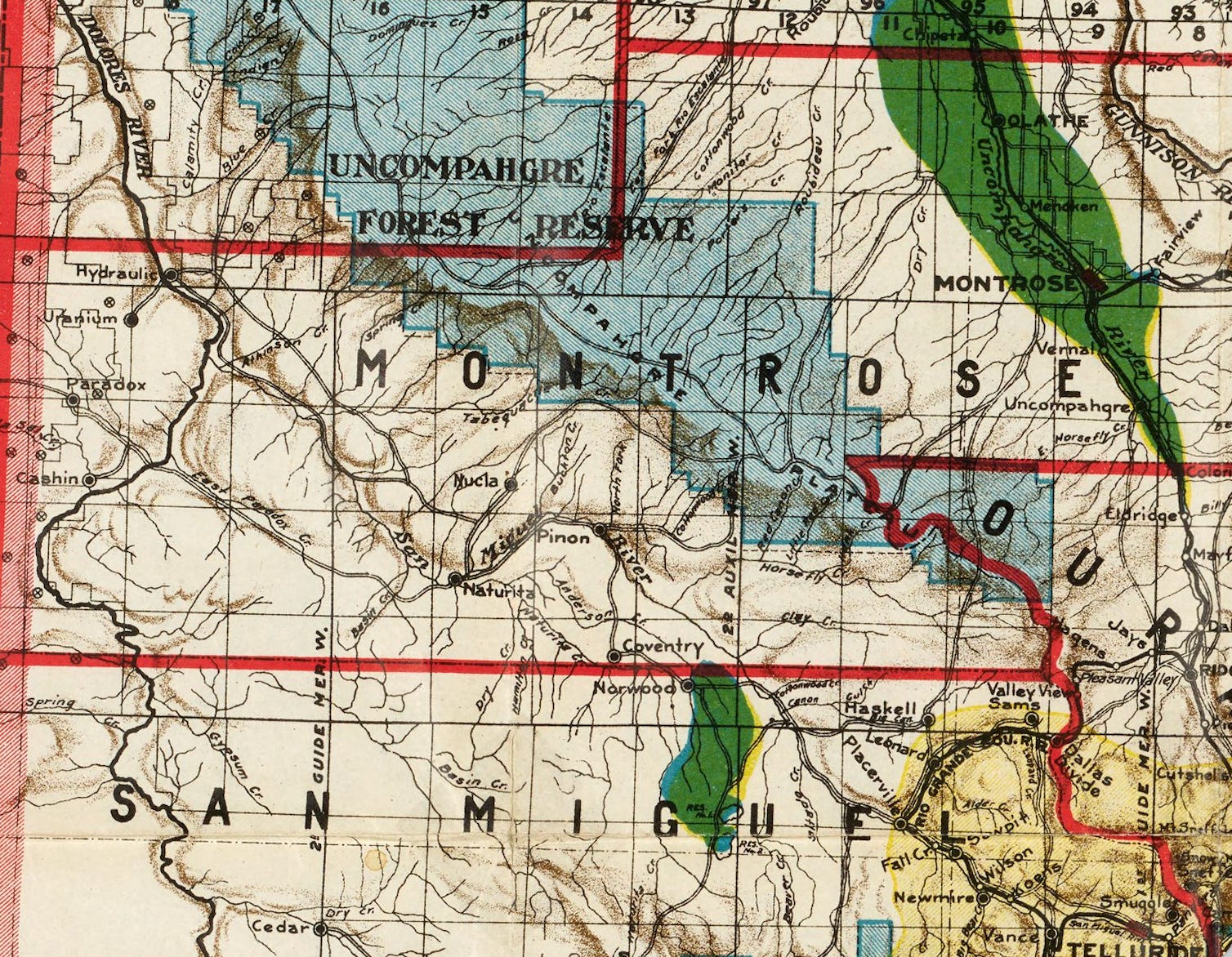 Detail from Clasonโs Industrial Map of Colorado, circa 1904. Unfortunately, I only had space for one outtake from this one, so look for more in the future, because itโs cool. Note how back then the road from Naturita to Norwood followed the San Miguel River to Piรฑon before heading south to Coventry (which is now Redvale, I guess?). Also, the towns of Hydraulic and Uranium on the Dolores River downstream from the confluence with the San Miguel. If anyone can point out those locations on a modern map, Iโd be much obliged!