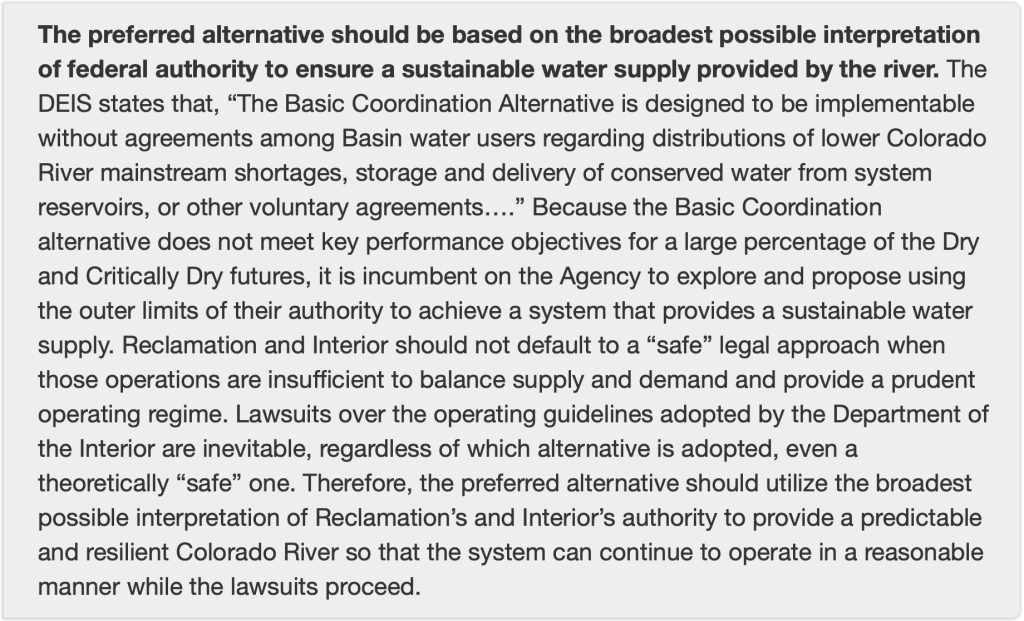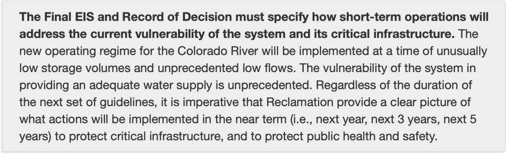 The BoRโsย โPost-2026 Operational Guidelines and Strategies for Lake Powell and Lake Meadโย offers five alternative scenarios for how to run the river. While it doesnโt give a โpreferredโ alternative, officials have indicated that without all of the statesโ approval or congressional action, they are only authorized to go with the Basic Coordination Alternative. That would include a minimum annual release of 7.0 million acre-feet from Glen Canyon Dam, with the largest mandatory cuts being borne by Arizona. But according to the BoRโs latest 24 month projection, that release level would lead to Lake Powellโs surface level dropping below minimum power pool by the end of this year, which is aย really big problem.