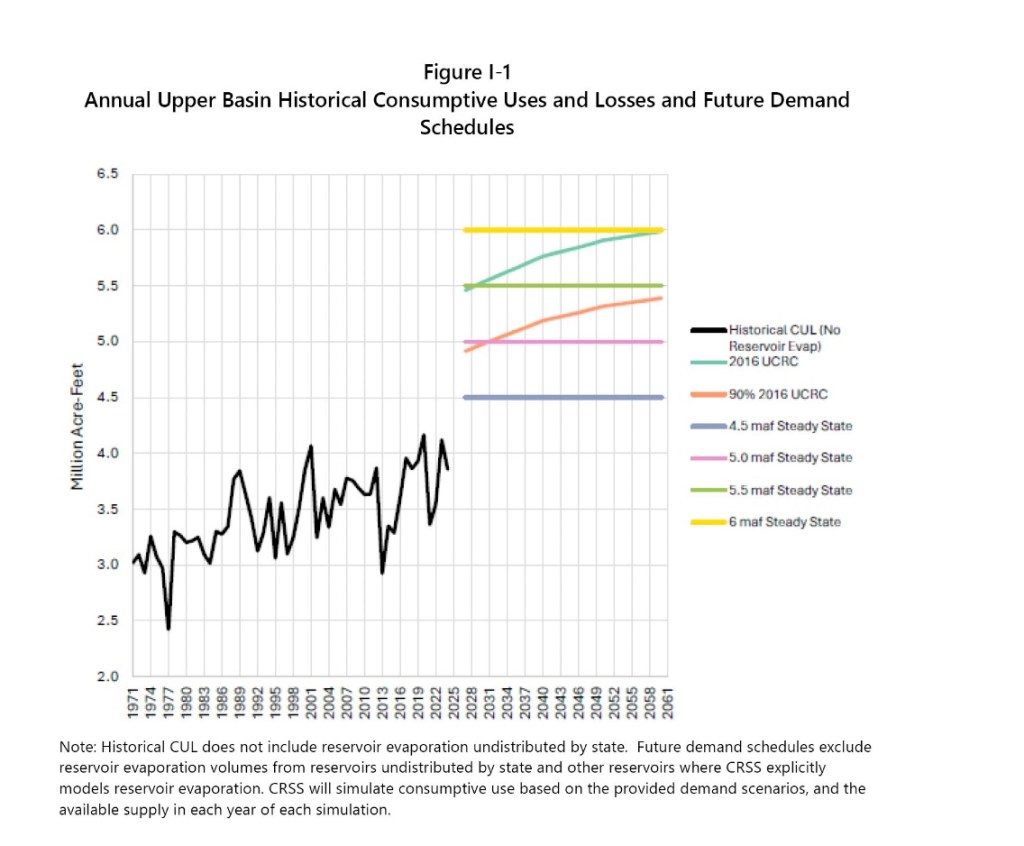 The Lower Basin states long used their entire 7.5 MAF allocation and then some, while the Upper Basin states use only about 4 MAF per year. In recent years, Arizona and California have cut consumptive use. Source: Bureau of Reclamation.