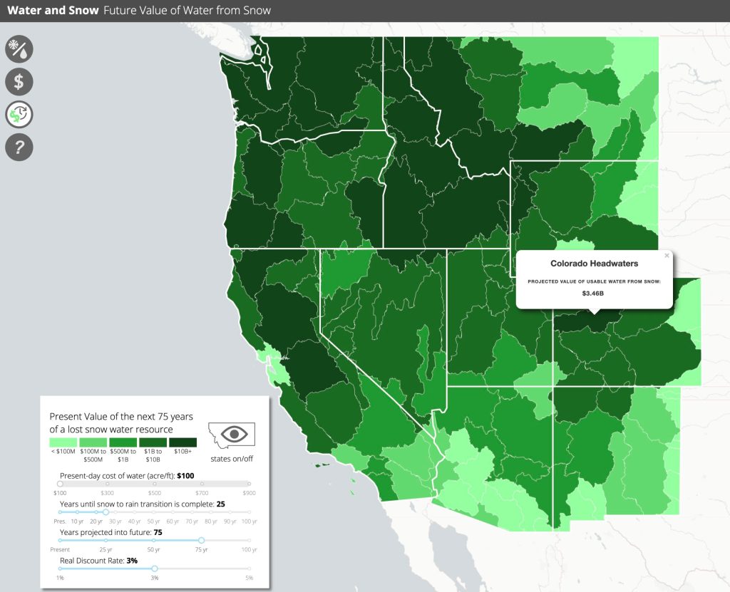 With their estimates of the amount of water lost as snow shifts to rain, the researchers could then multiply those figures by the cost of water to begin determining the decline in monetary value. The paper uses two water prices to bracket its estimates: $200 and $900 per acre-foot (an acre-foot is the volume of water needed to cover an acre of land to a depth of 12 inches, or 325,851 gallons).