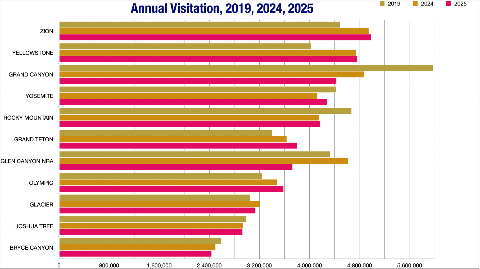 Grand Canyon NP and Glen Canyon National Recreation Area saw the biggest drops in year-over-year visitation in 2025, which may be due to a fire on the Grand Canyonโs North Rim and the drop in international travel to the U.S. Visitation continues to grow at Yellowstone, Grand Teton, and Olympic National Parks. Source: NPS.