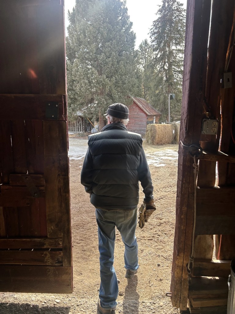 Jay Fetcher walks through a barn door on his ranch in Routt County, Colorado. Scott Franz/KUNC