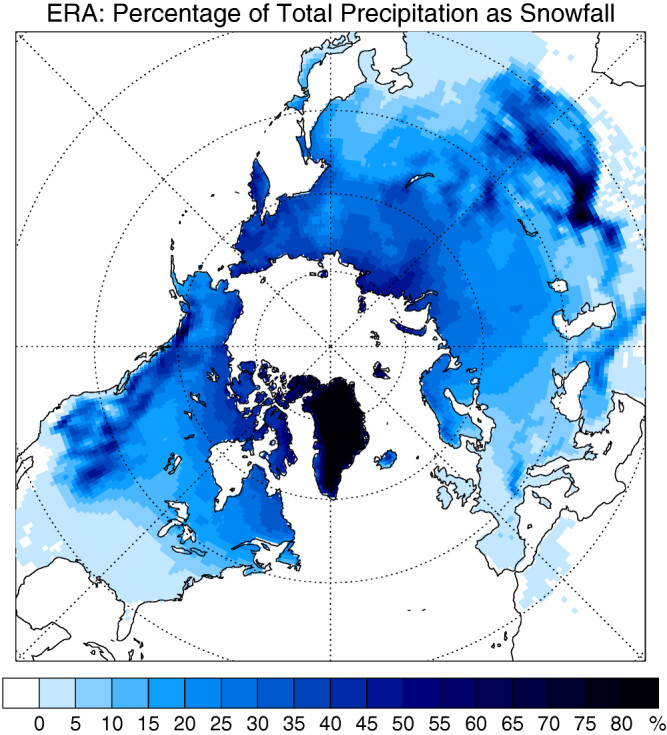 This map shows the share of annual precipitation that falls as snow over land, based on data from 2000 to 2010. In the Northern Hemisphere, the area where 40% or more of precipitation falls as snow covers more than 5.8 million square miles. At its peak, snow typically blankets more than 22 million square miles of the Northern Hemisphere. Source: Drew Slater, National Snow and Ice Data Center, via Sturm et al. (2017).