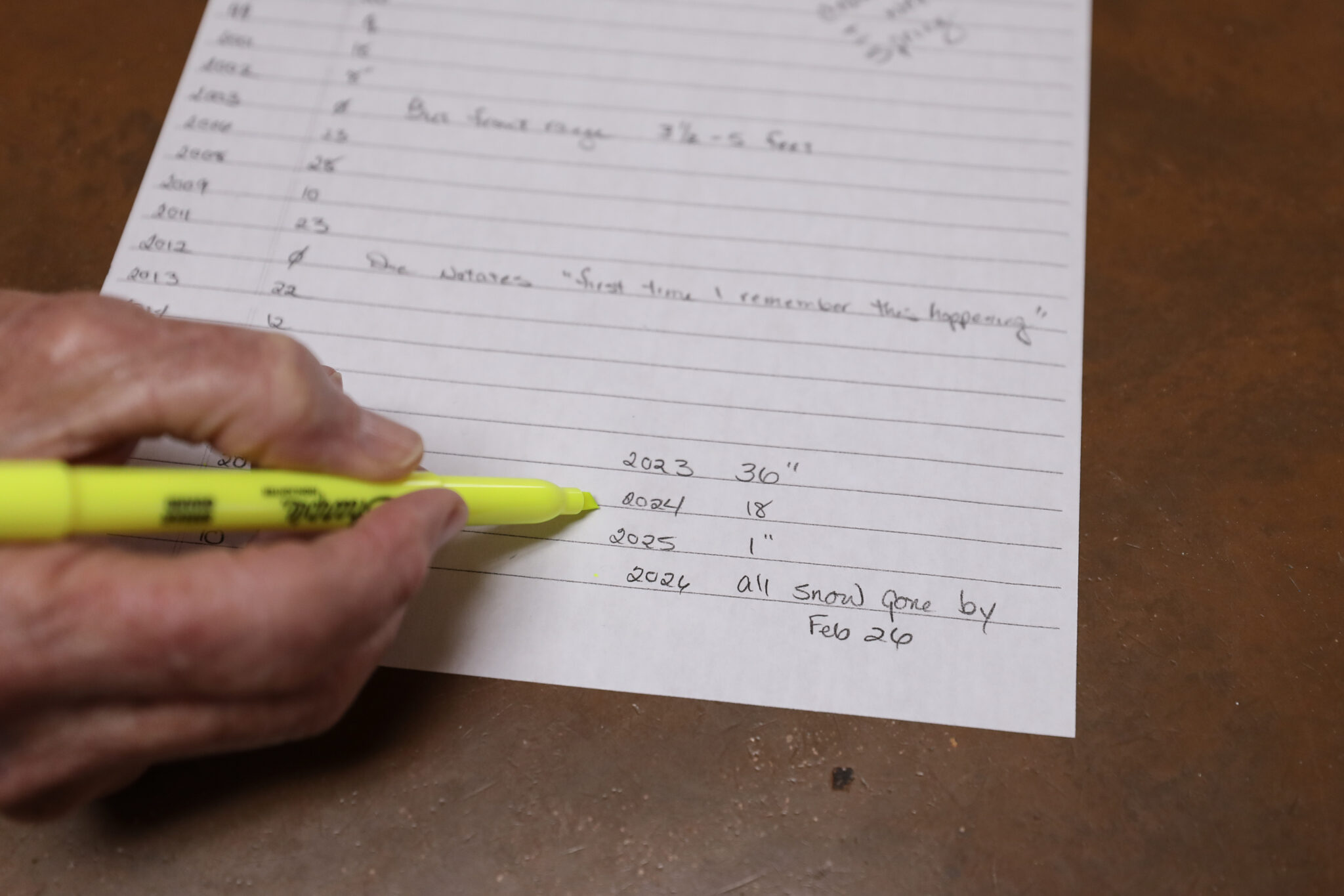 The most sobering of Docโs notations is also the most recent. During a visit in early March, the entry read, โall snow gone by Feb. 26.โ