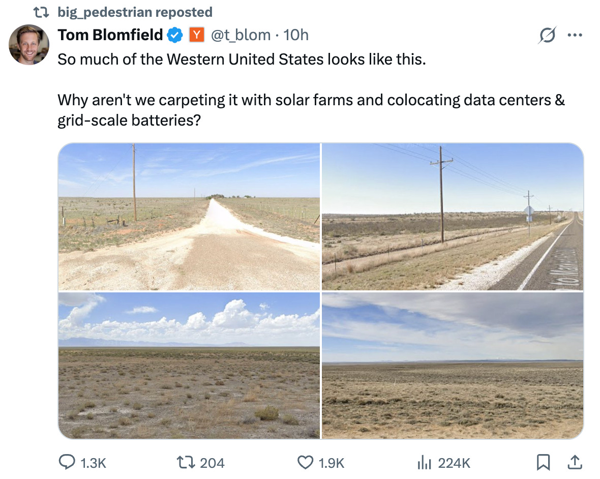 Granted, the spaces shown in this guyโs pictures do look like they may have been extensively grazed, but that does not mean they are appropriate places for a bunch of damned power- and water-guzzling data centers and their associated energy facilities.