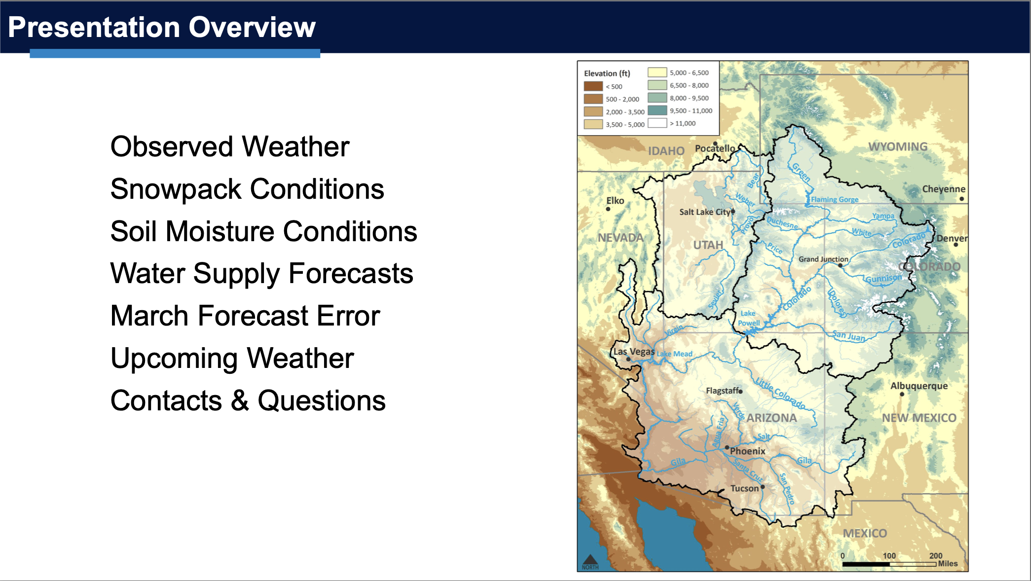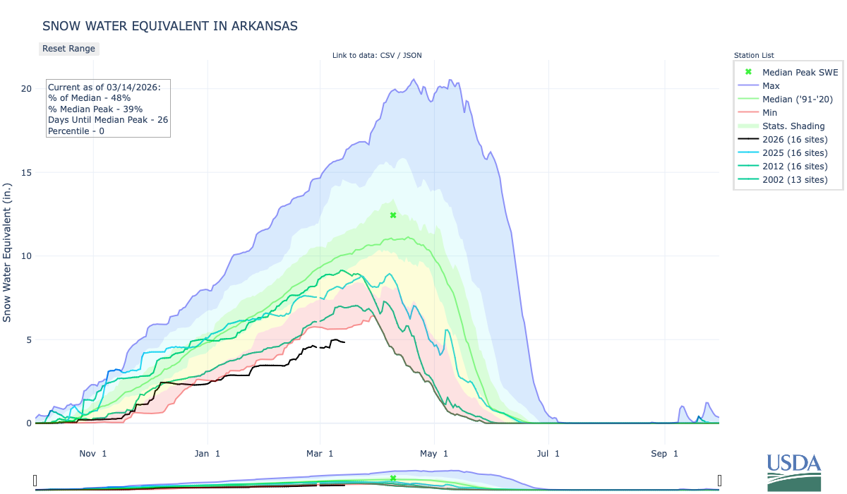 As of mid-February, La Niรฑa conditions are declining and there is a 90% probability of transitioning to ENSO-neutral conditions during March-May. The NOAA March Precipitation Outlook suggests equal chances while the March Temperature Outlook suggests an increased probability of above average temperatures throughout the region. The NOAA Seasonal Precipitation Outlook for March-May suggests an increased probability of below average precipitation in Colorado, Utah, and southern Wyoming, and particularly in the Four Corners region. The NOAA Seasonal Temperature Outlook for March-May suggests an increased probability of above average temperatures in Colorado, Utah, and southern and western Wyoming, and particularly in southern Utah and southwestern Colorado.