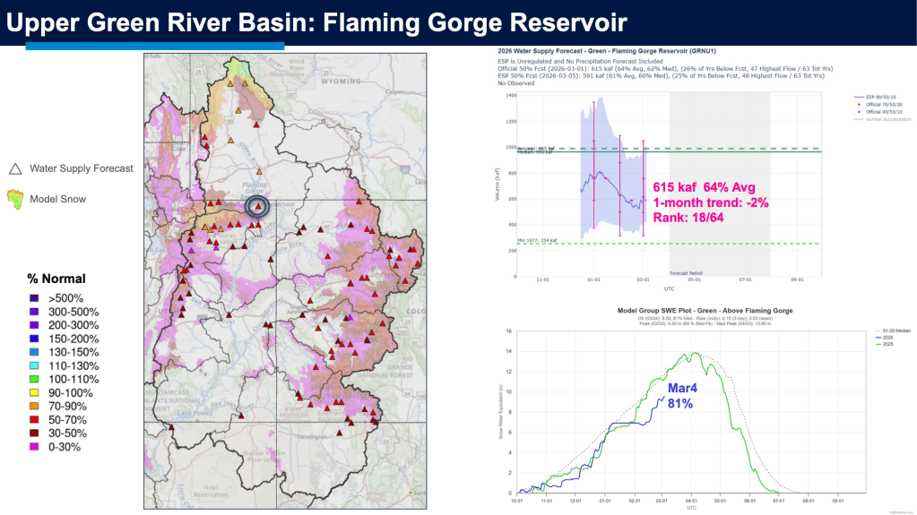 Seasonal streamflow volume forecasts for river basins in Colorado, Utah, and southeastern Wyoming are below to much below average. Near to above average seasonal streamflow volumes are forecasted for northern Wyoming. In Colorado, seasonal streamflow forecasts suggest 45-60% of average runoff for all major river basins. Runoff in most major Utah river basins is forecasted at 35-55% of average, except for the Bear River Basin (72%). Wyoming has a mix of streamflow forecasts, with below average forecasts in the Little Snake (46%), North Platte (52%), Cheyenne (57%), Upper Green (64%), and Laramie (69%) River Basins, near average forecasts in the Tongue (93%), Wind (93%), Powder (95%), and Yellowstone (108%) River Basins, and above average forecasts in the Shoshone (113%) and Big Horn (123%) River Basins. Below average inflow is forecasted for many regional reservoirs, including Lake Powell (36%), Navajo (44%), McPhee (47%), Blue Mesa (50%), Guernsey (52%), Deer Creek (53%), Scofield (56%), Deerfield (57%), and Flaming Gorge (64%) Reservoirs.