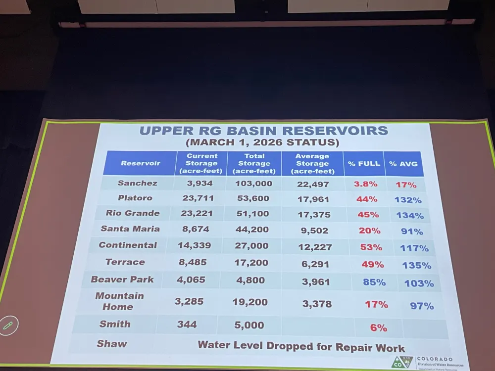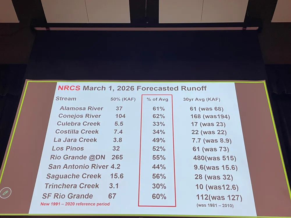 En 16 de marzo de 2026, el deshielo de la montaรฑa se encontraba cerca de niveles histรณricamente bajos: La cuenca del rรญo Colorado dentro del sistema de recolecciรณn de Denver Water estaba al 71โฏ% de lo normal. La cuenca del rรญo South Platte dentro del รกrea de recolecciรณn de agua de Denver Water estaba al 54โฏ% de lo normal. En las dรฉcadas de registros de Denver Water sobre sus cuencas hidrogrรกficas de recolecciรณn, al 16 de marzo el deshielo de la montaรฑa en la cuenca del rรญo Colorado ocupaba el tercer peor lugar y el deshielo de la montaรฑa en la cuenca del rรญo South Platte ocupaba el peor de todos.