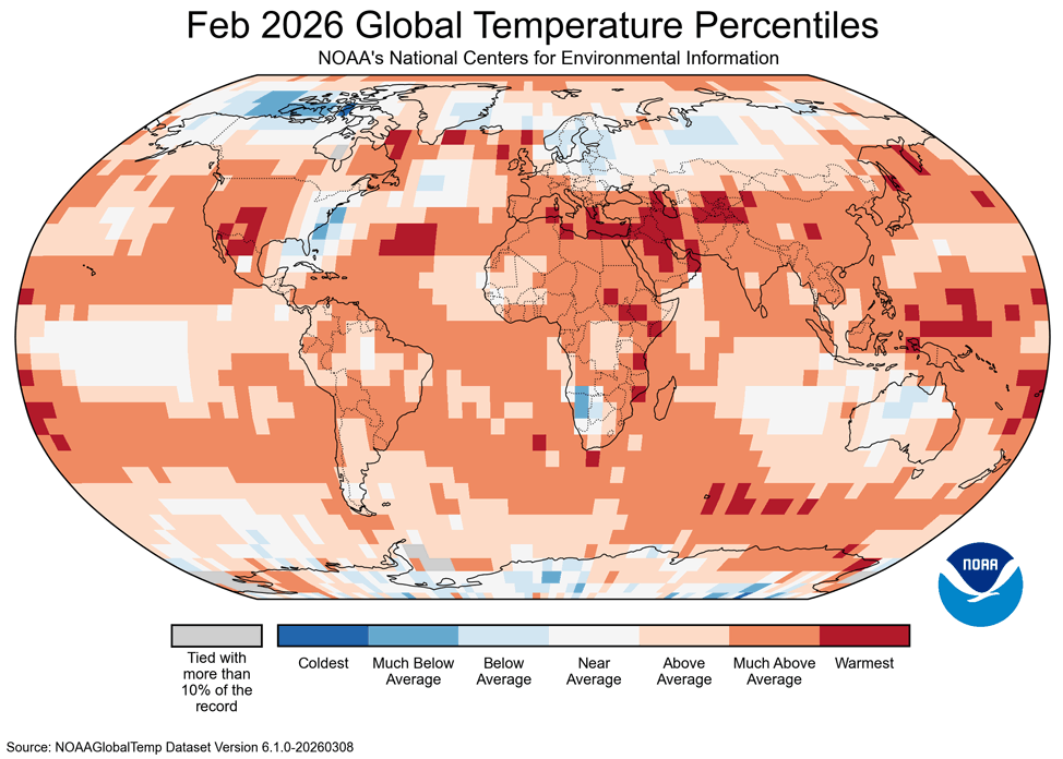Regional temperatures were much above average to record-warm in February. Large swaths of 9 to 12ยฐF above average temperatures occurred in each state, particularly in Wyoming and Colorado, and a large pocket of 12-15ยฐF above average temperatures occurred in southwestern Wyoming. Colorado and Wyoming experienced the warmest February on record, and Utah experienced the third warmest February on record.ย All three states experienced the warmest meteorological winter (December-February) on record.ย These records are ranked by NOAA NCEI from 1895-2026.