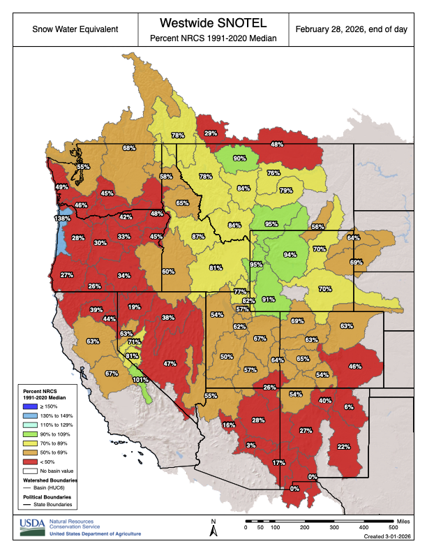 Current snowpack conditions across the western U.S. as of February 16, 2026. Map from NRCS SNOTEL.