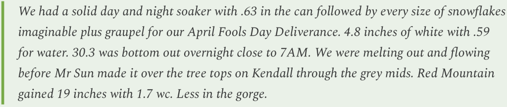 Silverton, Coloradoโs weather watcher Fred Canfield reports on a welcome burst of moisture at the high country burg in early April, writing: