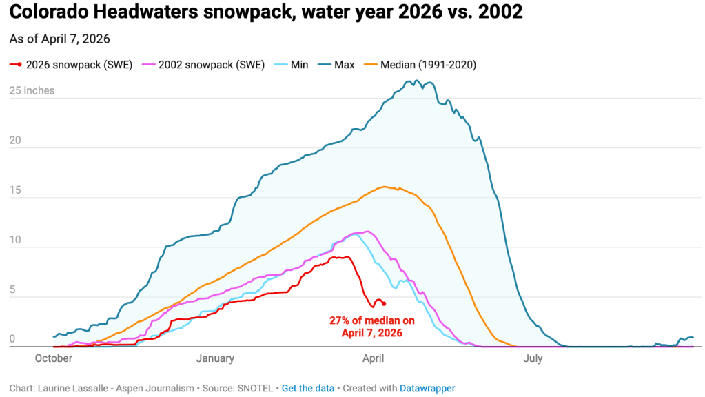 Crouched over a notebook, [Brian] Domonkos punched a calculator to arrive at a figure for the site. He let out a sigh when he arrived at the final number: 2.2 inches of snow-water equivalent, less than half the previous record low measured on the same date in 1977…Other measurements taken at snow courses around April 1 were just as alarming. Out of the 64 sites in Colorado with at least 50 years of data, 60 reported either record-low snow levels or tied the lowest on record…Those results confirm 2026 asย the worst year for Colorado snowpack in recorded history, said Russ Schumacher, a professor of atmospheric science at Colorado State University and Coloradoโs state climatologist. A lack of historical precedent means itโs harder to fully predict the impact of such low water levels. Schumacher, however, expects reservoir levels to rapidly decline in the summer and fall. Fire risk is harder to predict, but he saidย major wildfires usually appear in years when the snowpack is lowerย and melts early.ย