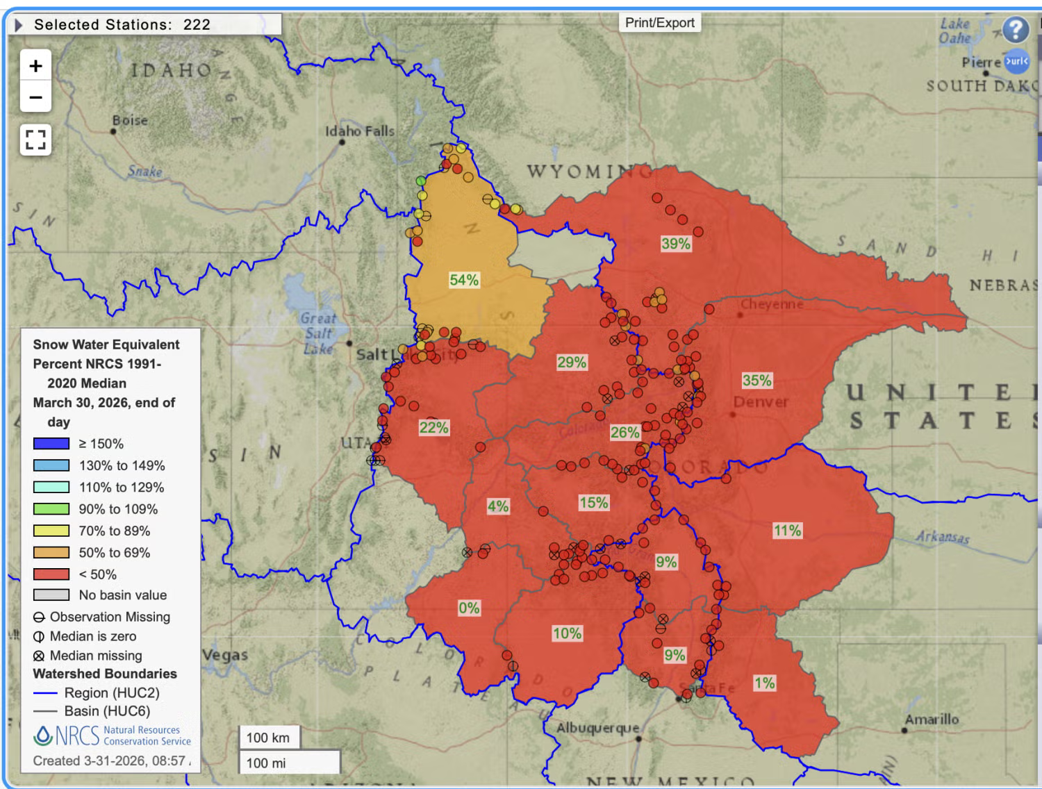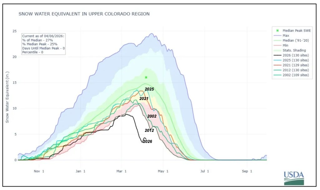 #Drought news April 9, 2026: In #Colorado, NRCS is reporting statewide #snowpack at the lowest on record. Historically, median peak SWE in Colorado occurs on April 8, however, this year peak SWE occurred on March 8 #runoff