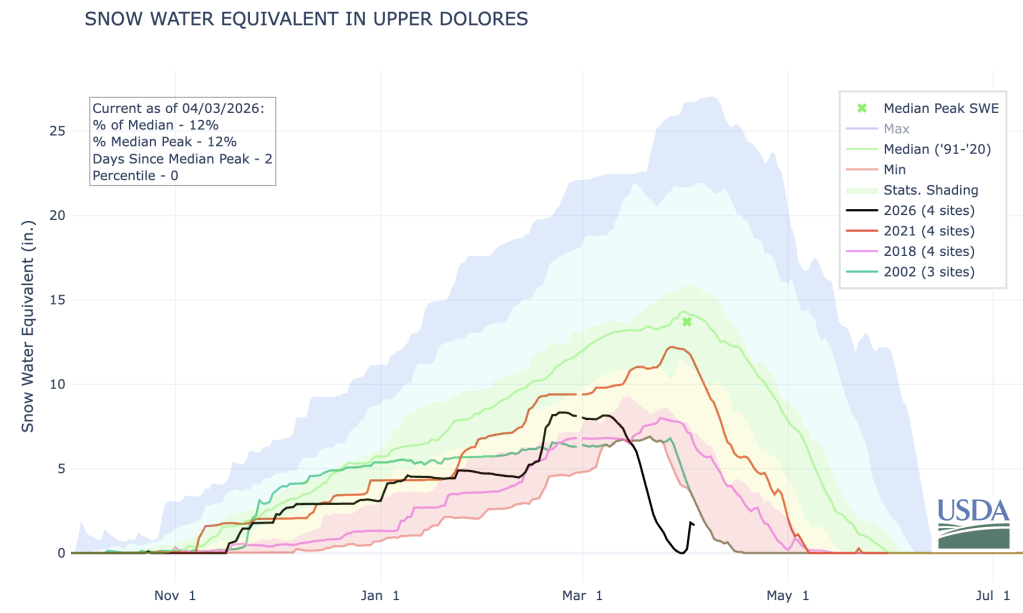 Iโm calling it: The Dolores River in Dolores reached peak spring runoff of 1,090 cubic feet per second on March 26. If this holds (and, yes, there is a chance that April showers will bring big May flows), then it will be the earliest peak on record by far. This is more an indication of how intense and unusual the end-of-March heat wave was than of how scant the snowpack was. It was the fourth lowest peak flow on record, behind 2002, 1977, and 2018.