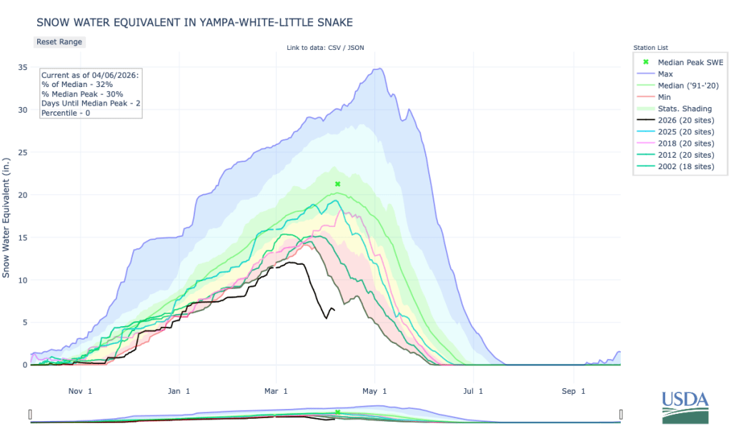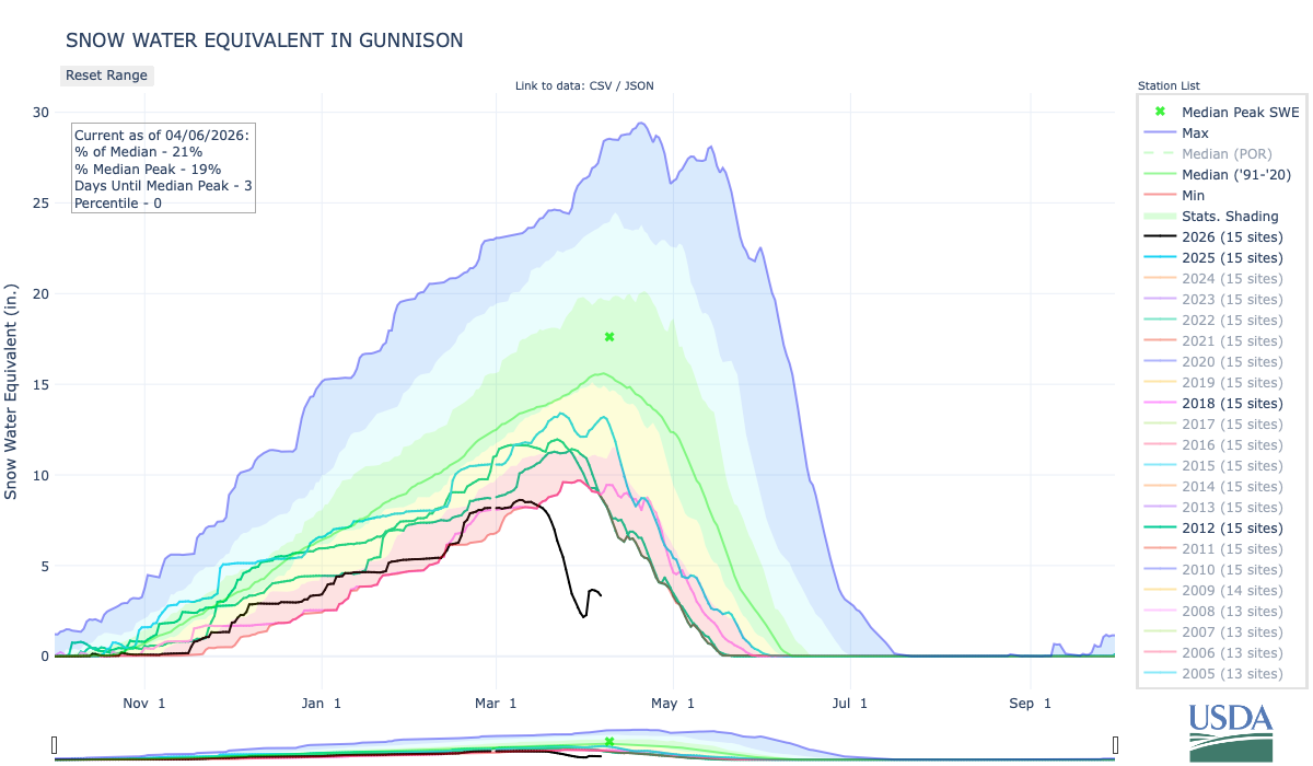 Snow water equivalent (SWE) has been tracking at or near record low much of the season. An extremely dry March and significant snowmelt during the last half of the month led to historically low April 1 snow water equivalent conditions across the region. An NRCS-Utah Snow Survey Special Report states that โat no time since systematic snowpack measurements began around 1930 has April 1 snowpack been this low in the state of Utah, and 2026 SWE is roughly five times lower than the previous record lowโ. A similar analysis performed by the Colorado Climate Center concluded that โthis has been the worst year for Colorado snowpack in recorded history, and most locations have less than half of the previous record lowโ.