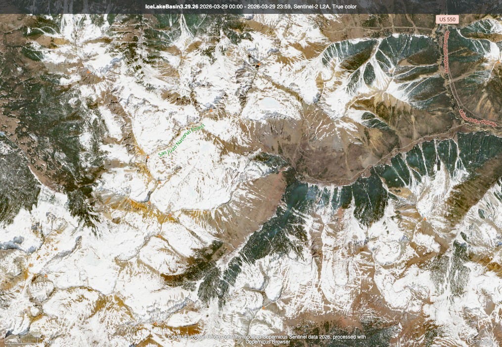 Last week I did the NASA Worldview satellite snowpack comparison, this time itโs Copernicus. The big difference is that you can zoom out more with Worldview, and zoom in for higher resolution looks with Copernicus. So here I went and found imagery from the San Juan Mountains in late February of this year, which is when snowpack levels peaked in the Animas River watershed, and another one from late March, following the big fat melt out.