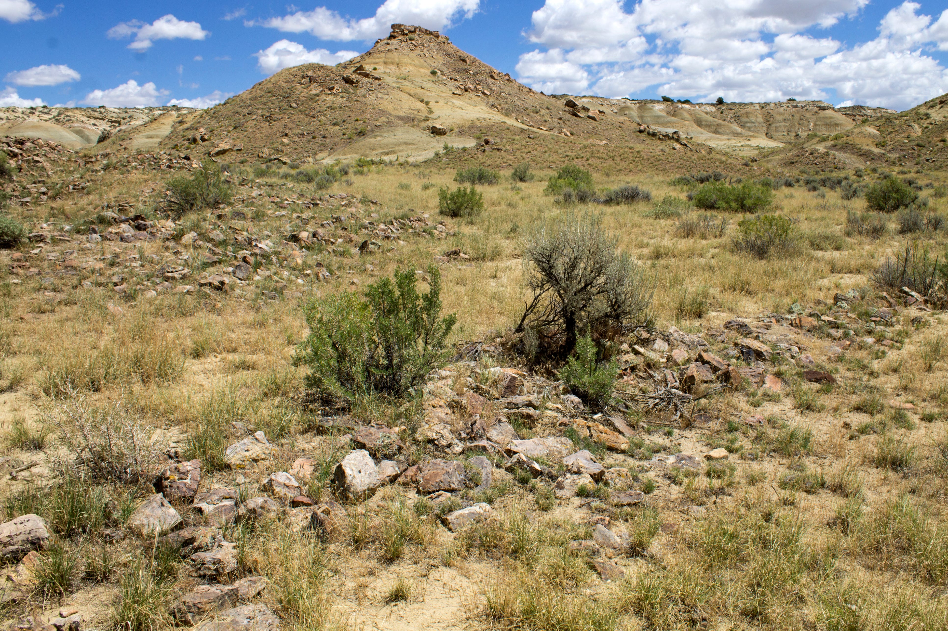 Rubble and a cone-shaped butte at Pierreโs Site, a Chacoan great house about ten miles north of Chaco Culture National Historical Park. The area around the site would be re-opened to new oil and gas leases under the Trump administrationโs proposal to revoke a Biden-era โbuffer zoneโ around the park. Jonathan P. Thompson photo.