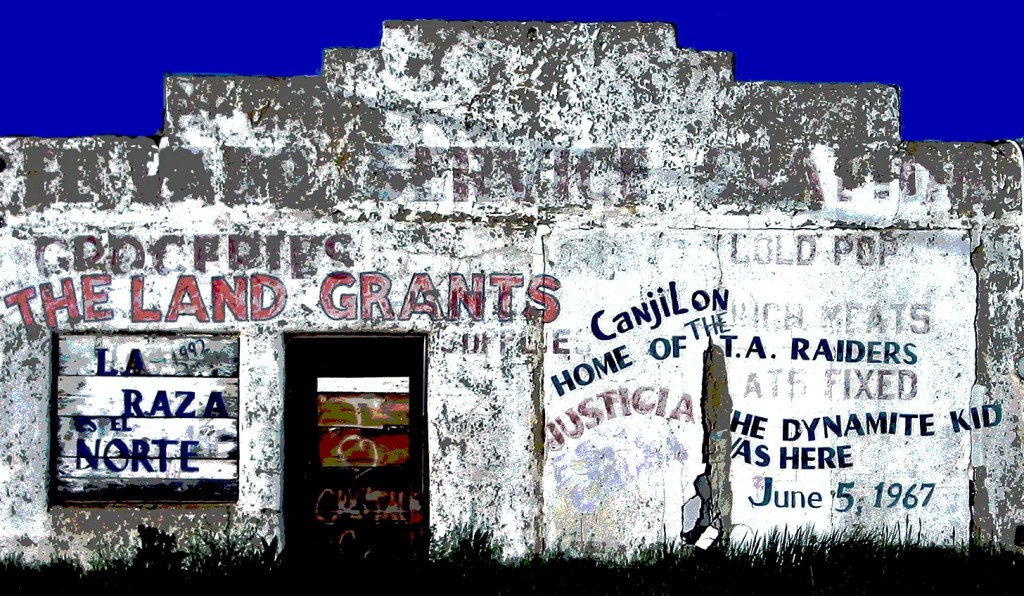 Storefront, Tierra Amarilla, New Mexico, with slogans remembering the 1967 Tierra Amarilla Courthouse Raid by Reies Lopez Tijerina to protest the federal governments theft of Mexican land grants. Now a Canadian company is proposing to explore for uranium near Canjilon. Ian M. Thompson photo.