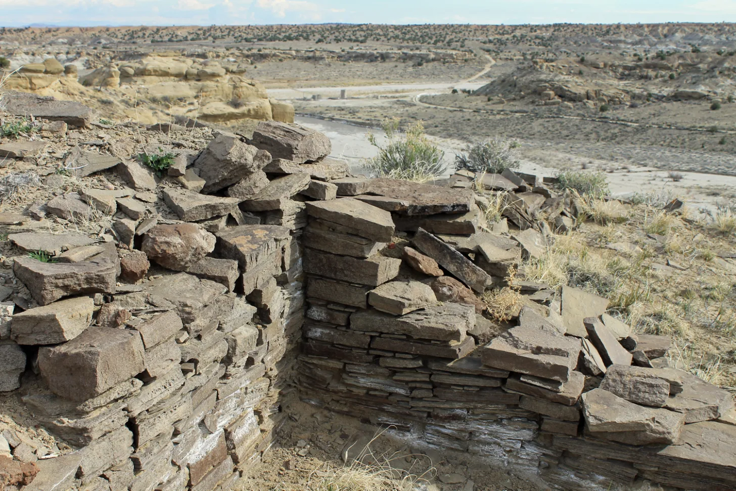 Wall at Twin Angels Great House, a Chacoan outlier along the Great North Road with an oil and gas well pad and tanks visible in the background. This site is well outside the 10-mile Chaco buffer zone. Jonathan P. Thompson photo.
