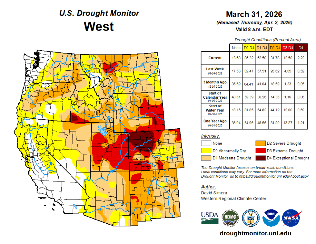 Per the latest US Drought Monitor, approximately 91% of the state is experiencing at least abnormally dry conditions, and ~74% of Colorado is experiencing drought (D1 or worse). Those numbers have increased from 54% and 45%, respectively, since the start of the water year on October 1, 2025. The recent warmth brought particularly large changes to the drought monitor last week, as Coloradoโs exceptional drought or worse area (D3 or higher) nearly doubled from ~13% last week to ~24% in the latest drought monitor.