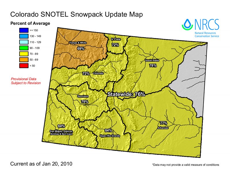 Statewide, the snowpack is well below normal as well. The Yampa River Basin is down to 69 percent of normal. The Upper Colorado River Basin and the Laramie and North Platte river basins are both 72 percent of normal, while the Gunnison River Basin today sits at 80 percent of normal. The Gunnison’s snowpack a year ago was 110 percent of normal.