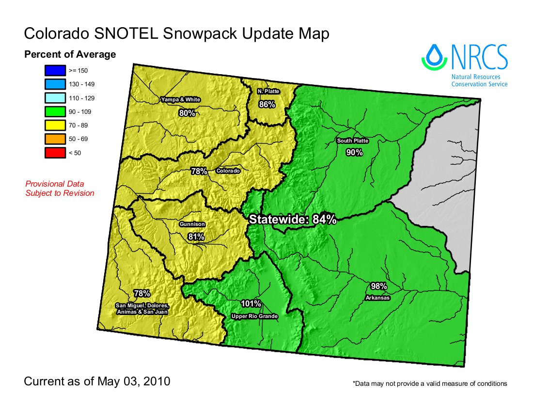 As of April 29, the Bureau of Reclamation reported the Colorado River basin registered among the lowest overall snowpack in the state at only 72 percent of average. Most of the other major basins ranged from 61-80 percent ranges, including the Gunnison Basin at 71 percent. The upper Rio Grande Basin topped the state list at 87 percent of average. Although reservoir storage remains adequate across the state, the lack of a snowpack to augment water needed for early-summer irrigation may mean shortages or cutbacks later in the year…
