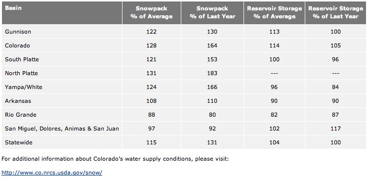 Click on the thumbnail graphic above and to the right for the NRCS table of snowpack and reservoir storage levels by basin.