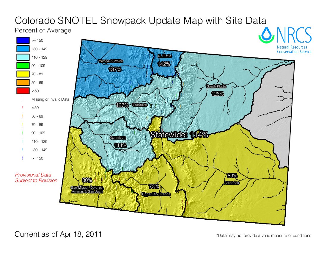 If you click on the thumbnail graphic to the right you’ll see a good representation of this winter’s La Niña effects on Colorado’s snowpack. Monster snowpack north drier conditions south. Here’s a reportfrom Scott Condon writing for the Glenwood Springs Post Independent. From the article: