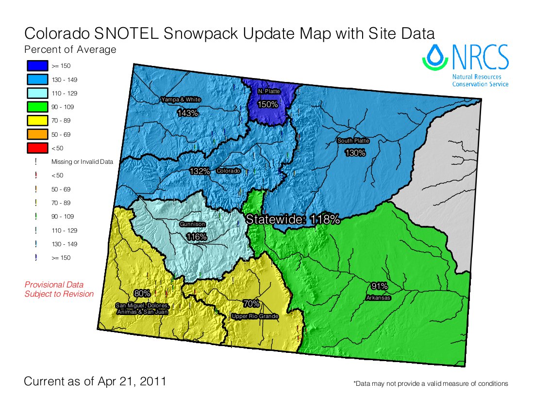 Yampa/White — snowpack 131% of average (the best since 1996 and second highest since the SNOTEL program began), this year has exceeded maximum values for the basin, streamflow forecast for the North Platte is 174% of average and the Yampa forecast is 157% of average.