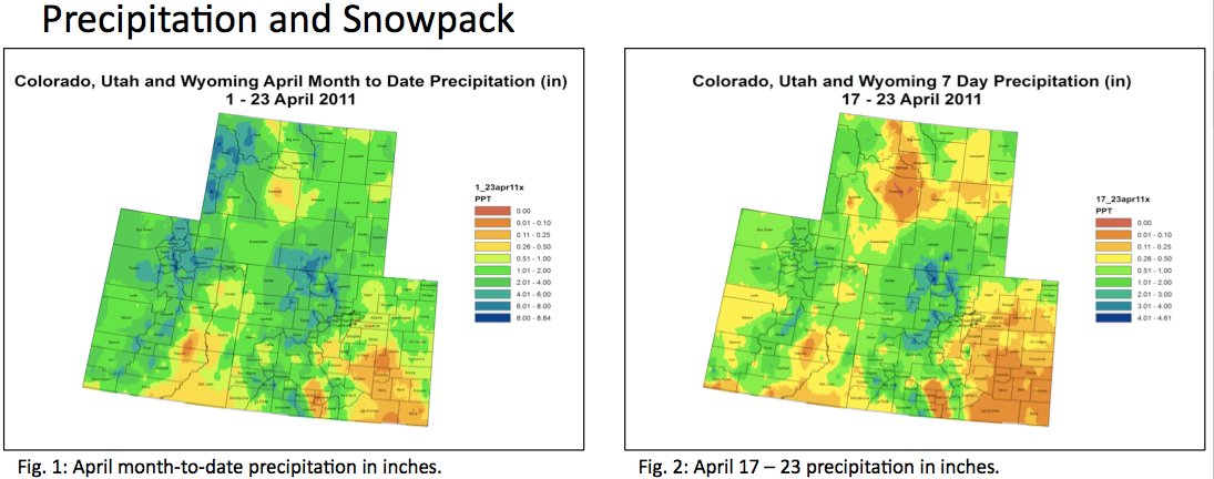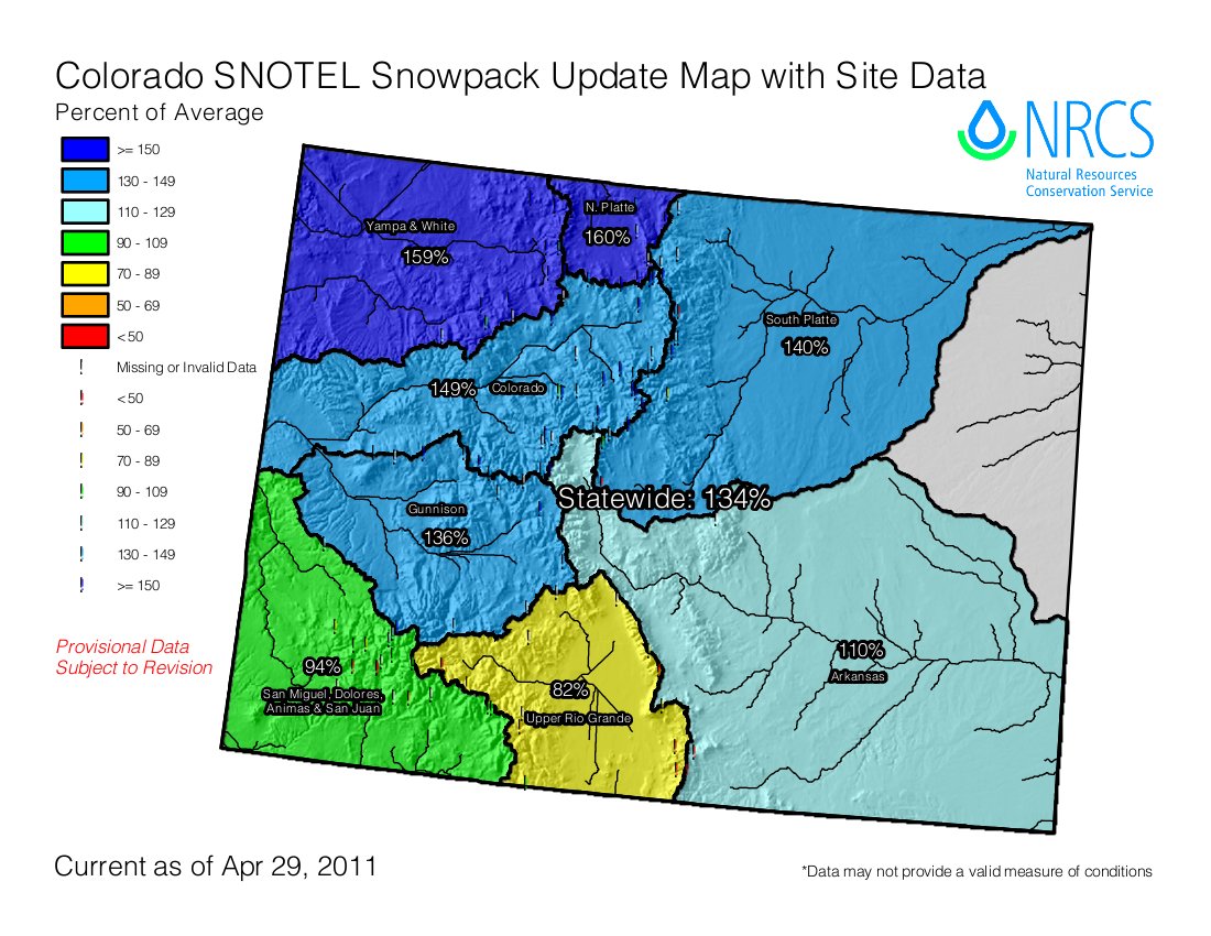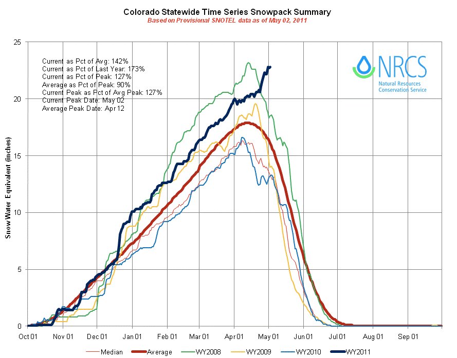 Last fall Klaus Wolter said, at a meeting of the Water Availability Task Force, “We’ve never really had a dry winter with La Nina.” Water year 2011 is no exception. Monster snowpack all across the northern mountains while the San Juans are gaining against average. The Rio Grande looks to have a tough year but even they’ve come up 3% against average over the weekend.