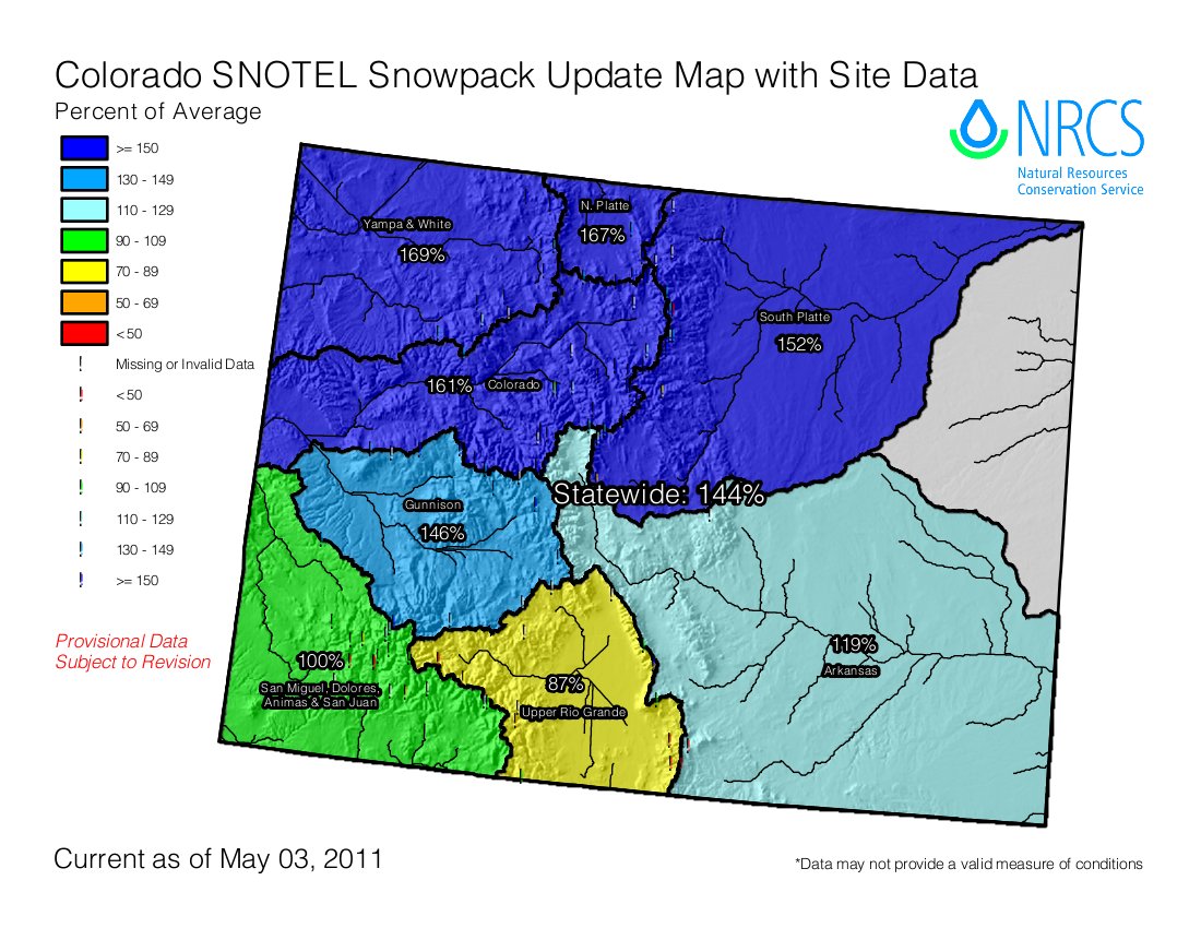 Most river basins and snowpack storage levels are running above average. The North Platte and Yampa basins are seeing the highest percentage of normal, while the Dolores and Upper Rio Grande are actually below normal, but not critical…