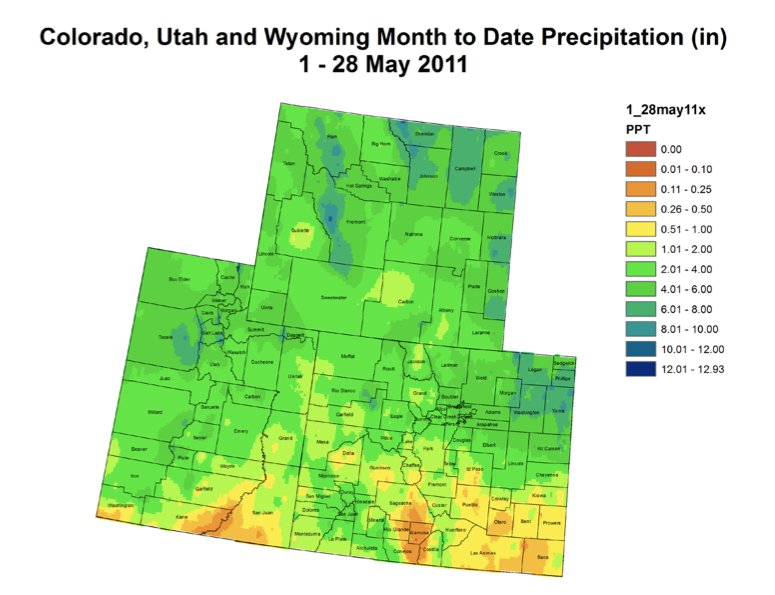 Currently, watersheds of greatest concern west of the Continental Divide are the Yampa River, Elk River, Colorado River, and the North Platte River along with their major tributaries. Flood advisories have already been posted for Mesa, Moffat, Routt, Grand and Jackson Counties, with more expected shortly. Lake County appeared on the watch list as well. Many of these rivers are already running well above the average flows for todayās date, and many are at, or close to, bank full. East of the Continental Divide, areas of largest concern are the Cache La Poudre River, the Big Thompson River and Clear Creek. These rivers are running much lower, but may quickly climb to higher peaks when warmer temperatures melt the abundant snowpack.