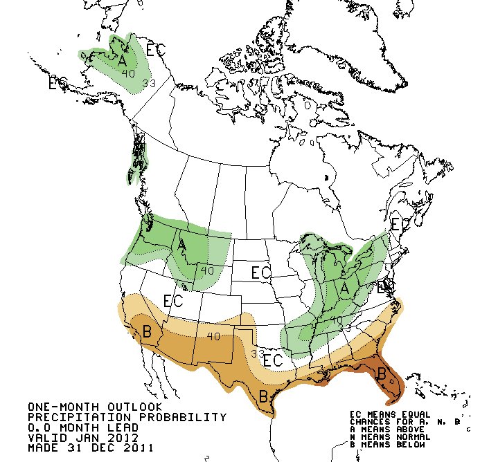 The Climate Prediction Center forecasts near-normal temperatures and near-normal precipitation for the Denver area this month. La Niña conditions will continue over the Pacific Ocean, so expect a typical January weather pattern with periods of mild weather and periods of cold weather.