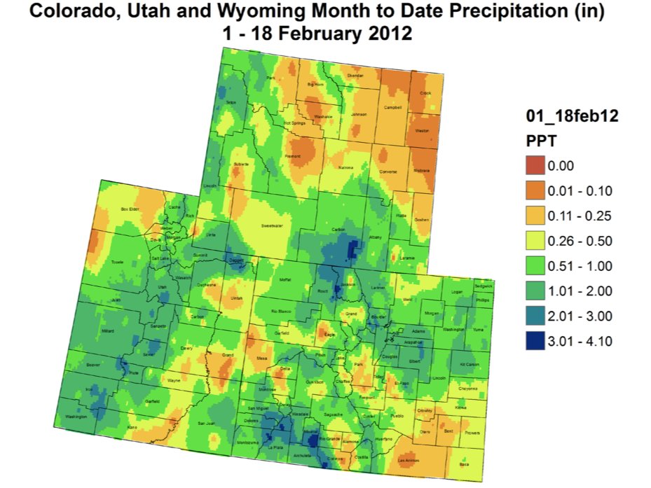 Click on the thumbnail graphic to the right for the precipitation summary map for February 1-18, 2012. Here’s the link to the slides from yesterday’s webinar from the Colorado Climate Center.