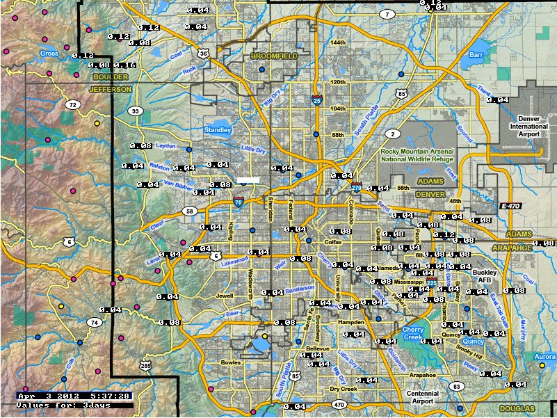 Click on the thumbnail graphic to the right for the 3-day precipitation map for the Denver area from the Urban Drainage and Flood Control District. The two stations nearest Gulch Manor reported .28 and .47 inches of beautiful moisture.