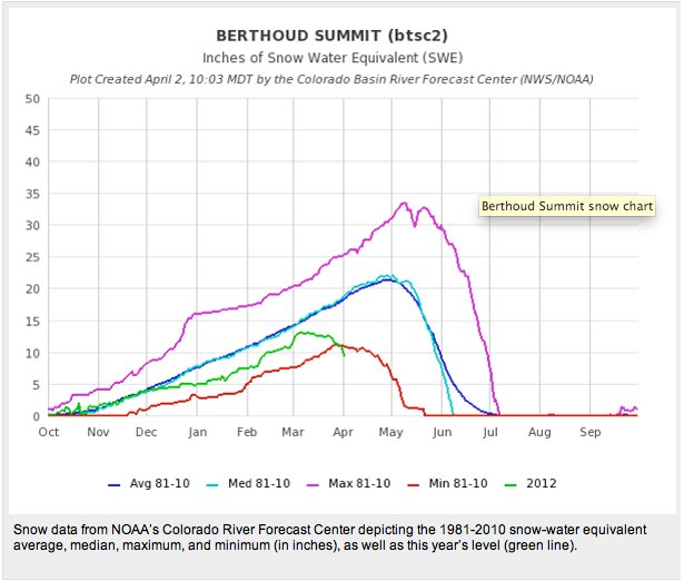 The message from the NRCS is no surprise to Coyote Gulch readers. We’ve been chronicling the precipitous decline in snowpack over the past month. Click on the thumbnail graphics for the latest snowpack map and table of snowpack and storage numbers for April 1, 2012, from the Natural Resources Conservation Service, as well as the Ogive of the Berthoud Pass Snotel (Climate Prediction Center via National Geographic). Here’s the release from the Natural Resources Conservation Service (Mage Skordahl):