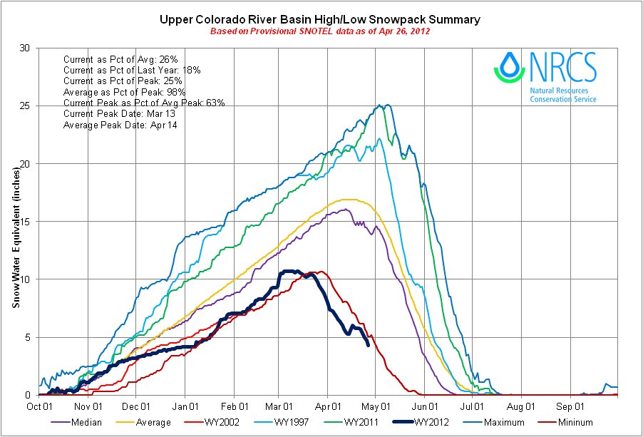 Click on the thumbnail graphics for the current statewide snowpack map and the Basin High/Low graph for the Colorado River Basin from the Natural Resources Conservation Service.