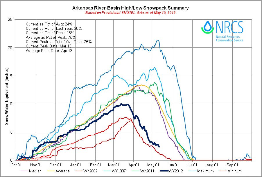 The latest snow surveys conducted by the NRCS show that most low- and mid- elevation-measurement locations have little or no snow, and the higher-elevation sites are well-below average and rapidly melting. The May 1 statewide snowpack report reflects this; measuring just 19 percent of average. For the second month in a row, statewide snowpack conditions match those recorded during the record-setting drought year of 2002. In the Arkansas River Basin, snowpack is at 25 percent of average and 22 percent of the amount measured at this time last year.
