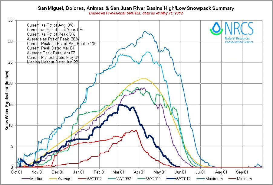 Click on the thumbnail graphics for the current U.S. Drought Monitor map, the Basin High/Low graph for the San Miguel/Dolores/Animas and San Juan basins and the current statewide snowpack map. Snowpack across Colorado is in single digits. All of the state is in one stage of drought or another except parts of the South Platte basin which are merely abnormally dry.