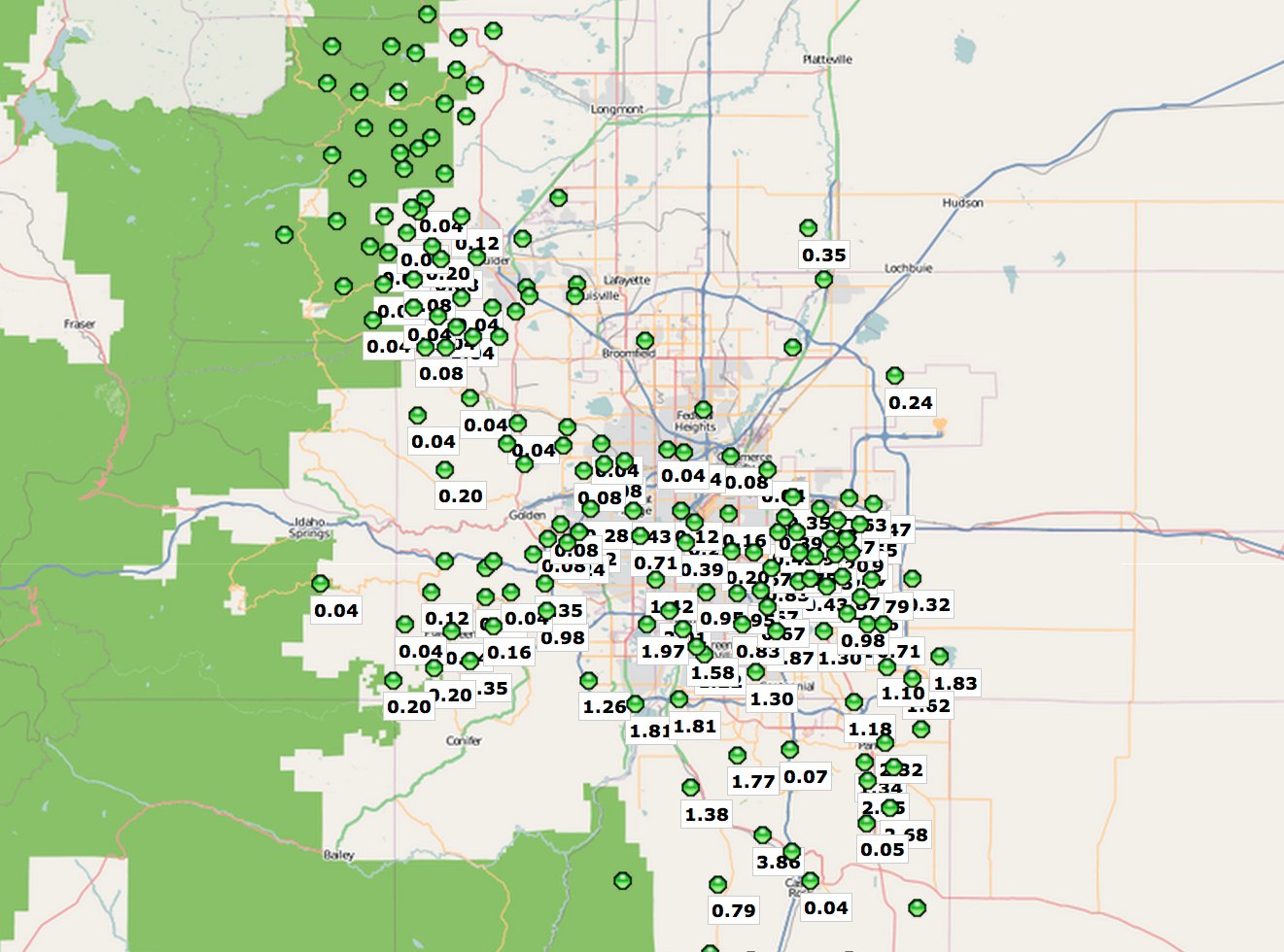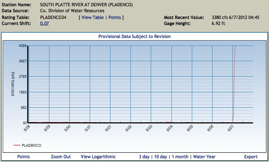 Tornadoes, flash floods, lightning strikes and downpours were all present in the band of storms that moved across the Denver Metro Area and points south and east yesterday afternoon and evening. When storms are slow moving, as they were yesterday, precipitation totals can be impressive while overwhelming stormwater facilities. Click on the thumbnail graphics for a screen shot of the 24 hour map from the Urban Drainage and Flood Control District and the hydrograph from the South Platte River at Denver stream gage from the Colorado Division of Water Resources website. The hydrograph is the very picture of a flash flood.