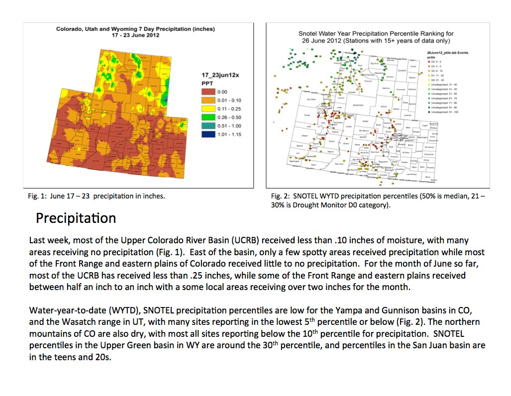 There wasn’t much good news during yesterday’s webinar. The onset of the North American Monsoon for a couple of days was about it. Click on the thumbnail for the precipitation summary along with a map showing water year to date snowpack for the Upper Colorado River region. Click here for the summaries from the webinar from the Colorado Climate Center.