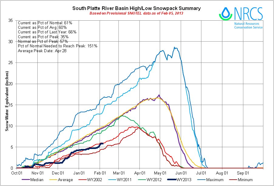 NRCS reports showed that snowpack in the South Platte basin — which melts in the spring to refill northern Colorado cities’ reservoirs and farmers’ irrigation ditches — was 54 percent of the historic average, and 58 percent of where it was at this time last year. In the Colorado River basin, where the Front Range and other northern Coloradans also get some of their water supplies, snowpack was 67 percent of average, and reservoir storage, too, was 67 percent of historic average.