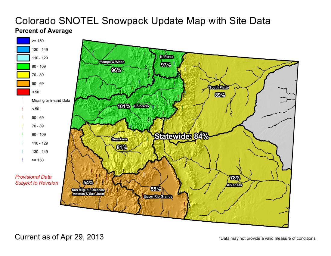 Statewide, the high country snowpack was still at 95 percent of normal for Friday’s date, and 87 percent of average for the season, according to Mage Hultstrand of the Natural Resources Conservation Service in Denver. As of Friday, the Colorado River Basin remained just above the 100 percent threshold for both the normal and seasonal average, Hultstrand said.