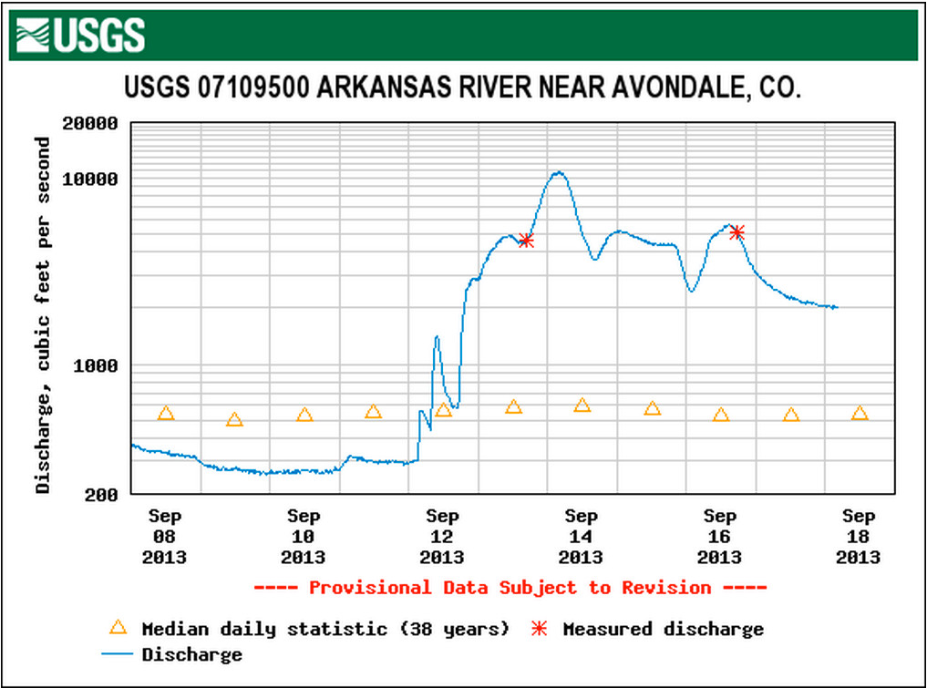 On Friday, Fountain Creek at Pinon passed flood stage for about 12 hours. Later, the Arkansas River at Avondale crested at 9.5 feet, about 2.5 feet above flood stage, and remained high for nearly a full day. It briefly reached flood stage again on Monday afternoon, but quickly dropped. [Click on the thumbnail graphic for the Arkansas River at Avondale hydrograph.]