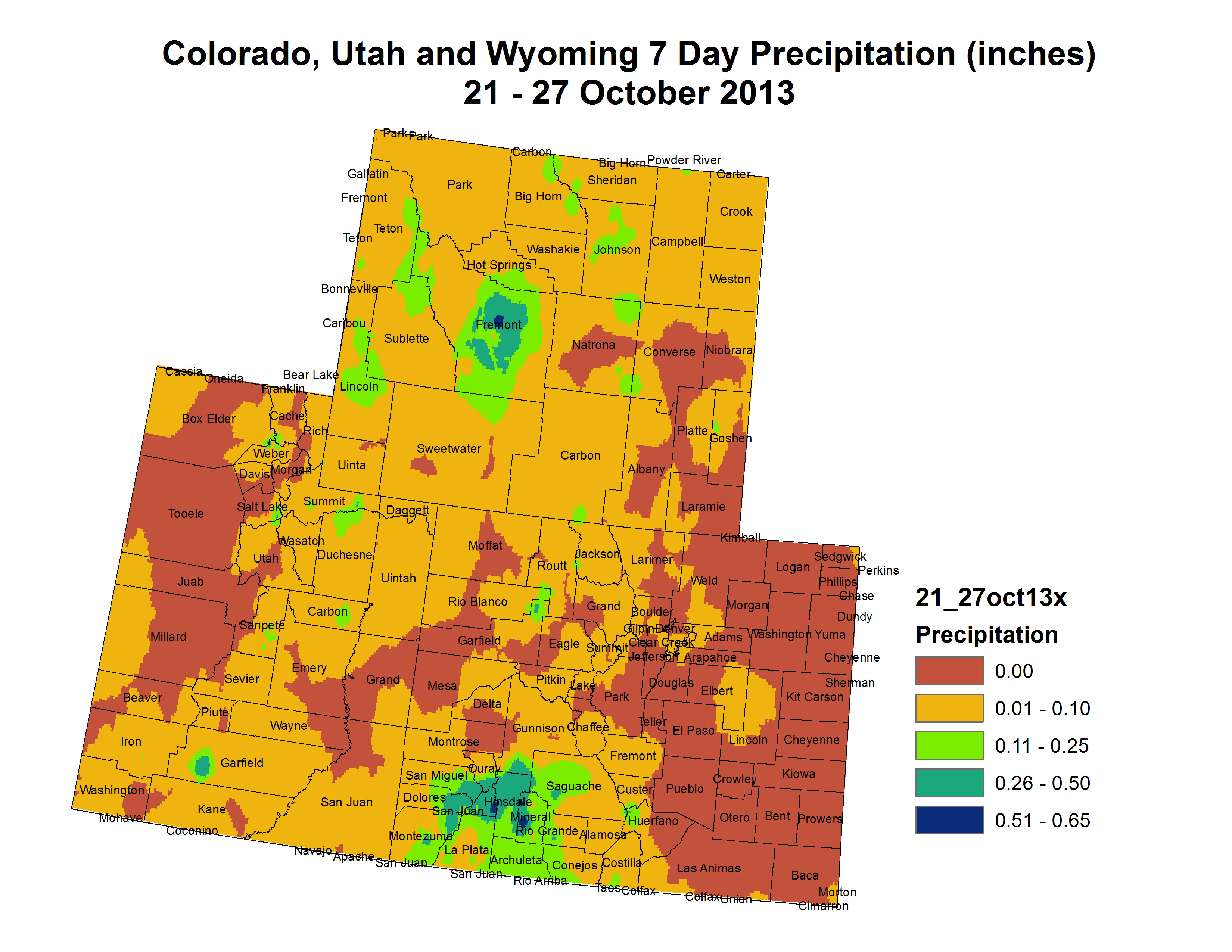 Weekly Climate, Water and Drought Assessment of the Upper #ColoradoRiver Basin Upper Colorado River Basin Precipitation from October 21-27, 2013 via the Colorado Climate Center Click here the read the current assessment. Click here to go to the website hosted by the Colorado Climate Center. Share this: Share on Bluesky (Opens in new window) Bluesky Share on LinkedIn (Opens in new window) LinkedIn Share on Facebook (Opens in new window) Facebook Email a link to a friend (Opens in new window) Email Print (Opens in new window) Print Share on X (Opens in new window) X Like this:Like Loading...