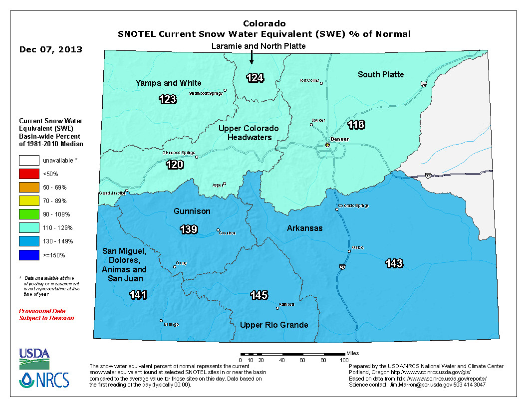 Snowpacks are above normal across nearly all of the three-state region, with the wettest basins (>140% of median) in northern Wyoming, southern Utah, and the southern half of Colorado, and the driest basins (80–100% of median) in northern and central Utah and far southwestern Wyoming.