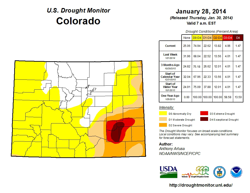 In Arizona, another week passed without precipitation. The last measurable precipitation in Flagstaff fell just before Christmas (December 20th). A predominantly dry pattern has been in place since the very beneficial and welcome late-season monsoon rains last September. Impacts are somewhat limited at this time due to lower ET rates during winter, but an increased snowpack in the next two months is needed to preclude more serious problems. SNOTEL Snow Water Equivalent (SWE), as of January 29, 2014, is mostly well below normal across the Mogollon Rim area (ranging from 18-44 percent), and in the White Mountains of eastern Arizona (SWE 27-40 percent of normal). As a result, a 1-category downgrade was made for both areas. In northern New Mexico’s Sangre de Cristo Mountains, SWE’s range from about 56-62 percent of normal. The last significant snowfall event for this region occurred from November 21-24, 2013, when about a foot of snow fell. Continued dryness since that time and fairly low SWE’s prompted a one-category downgrade across much of northern New Mexico up to the D3 designation.
