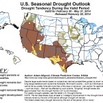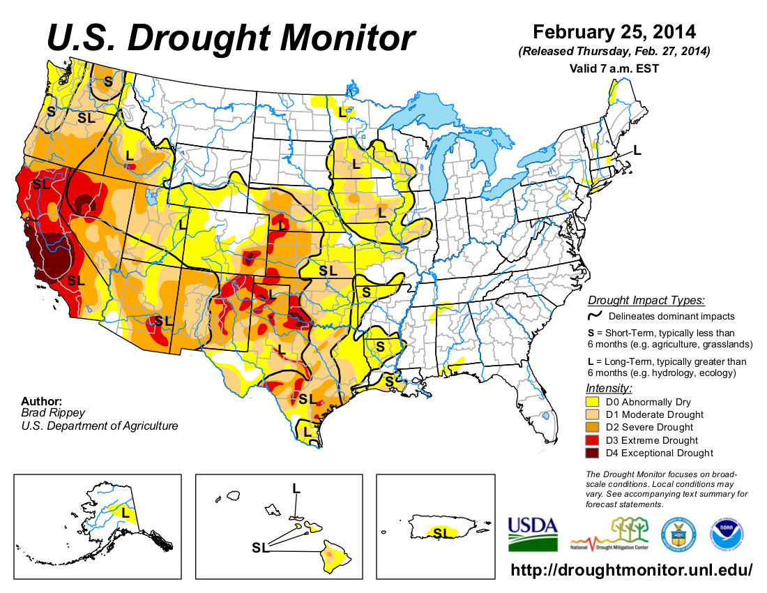 Dry weather dominated the central and southern Great Plains, although warmth yielded to colder conditions. There were broad expansions of various categories of dryness and drought in southeastern Kansas and parts of Oklahoma and Texas. In Texas, the portion of the winter wheat crop rated in very poor to poor condition climbed to 47 percent on February 23, up from 28 percent in late-November 2013. Additionally, 52 percent of Texas’ rangeland and pastures were rated very poor to poor on February 23, up from 30 percent just 3 months ago. Spring planting is underway across Deep South Texas (e.g. Texas corn was 3 percent planted, statewide, by February 23), and moisture will be needed soon as fieldwork moves northward. By February 23, statewide topsoil moisture was rated 75 percent very short to short in Texas. Roughly the southern half of the Great Plains region is facing a potential fourth consecutive summer of drought—a stretch that began with the historic drought of 2011. Texas cotton abandonment, which until recently only exceeded 40 percent only once (in 1998), has topped 40 percent in three consecutive years (2011, 2012, and 2013)…